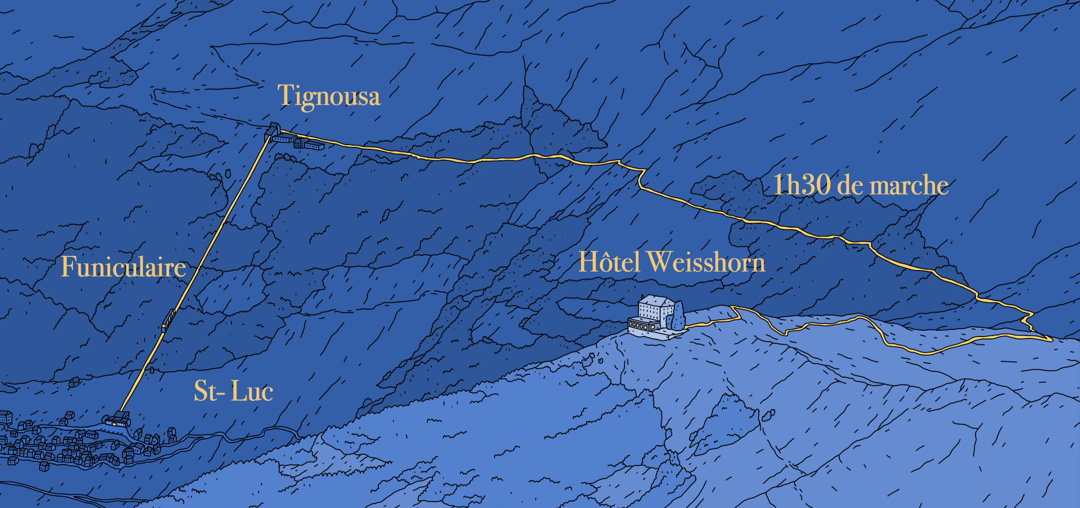 L’Hôtel Weisshorn qui culmine à 2337m d’altitude n’est accessible que par une petite randonnée depuis l’arrivée du funiculaire St-Luc/Tignousa.